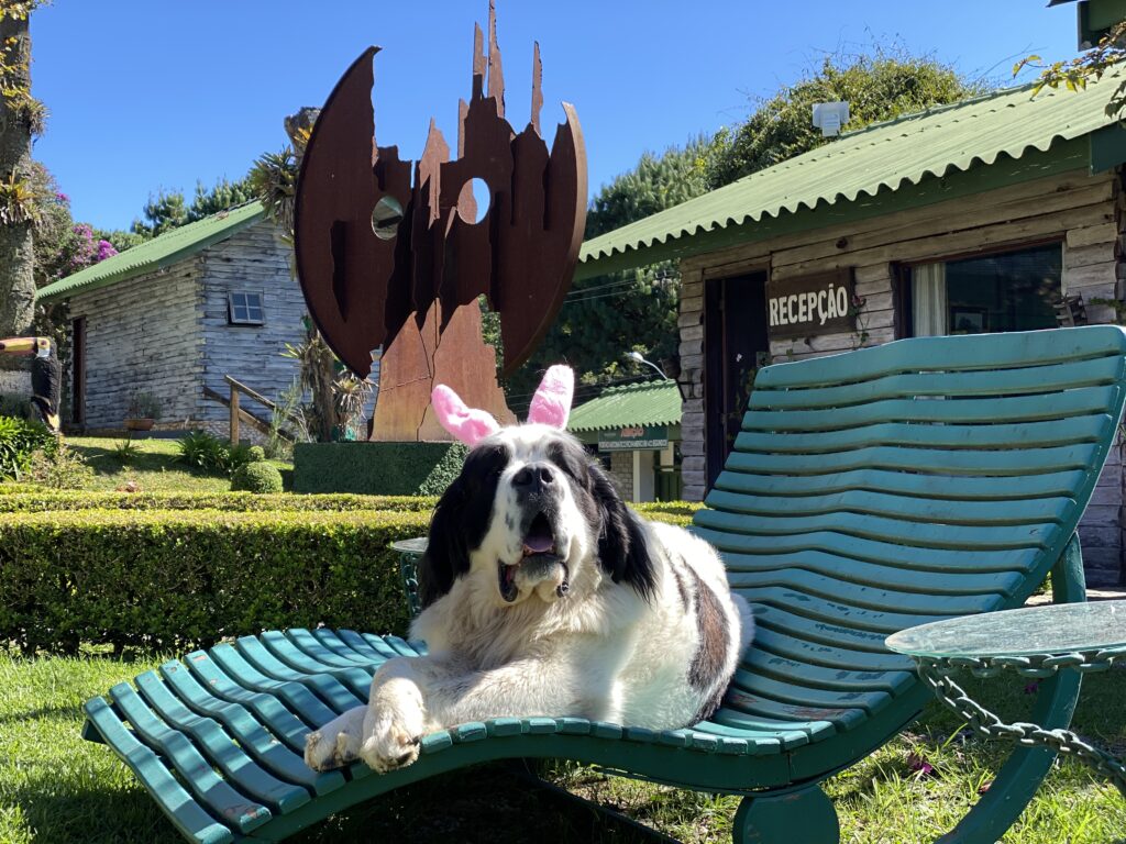 Cão São Bernardo vira mascote de Páscoa da Pousada Alto da Boa Vista em Campos do Jordão