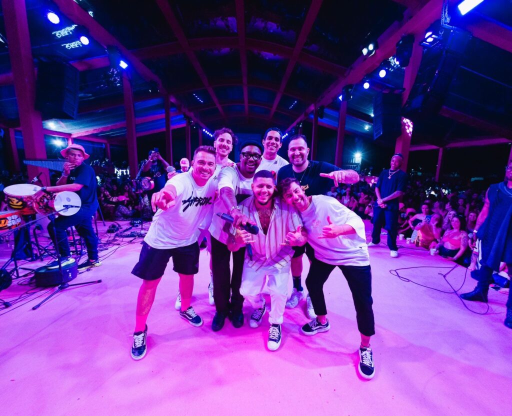 Em seguida, foi a vez do grupo Jeito Moleque ser recebido com o calor de quem estava no evento. Animados para entrar no palco, os integrantes comentaram que já tinham sido chamados para edições anteriores, mas a agenda impossibilitava o encontro. “O convite já veio algumas vezes já, só que, infelizmente ou felizmente, a gente não tinha agenda, né? Então, hoje calhou de dar certo e a gente já tinha ouvido falar muito”, falou Gui Albuquerque, vocalista da banda. “Nossos amigos frequentam o evento há muito tempo, desde as primeiras edições. Então, a gente tá muito feliz e ansioso para subir nesse palco, cantar os sucessos desses 25 anos de Jeito Moleque e fazer essa galera cantar até o dia clarear”, completou.