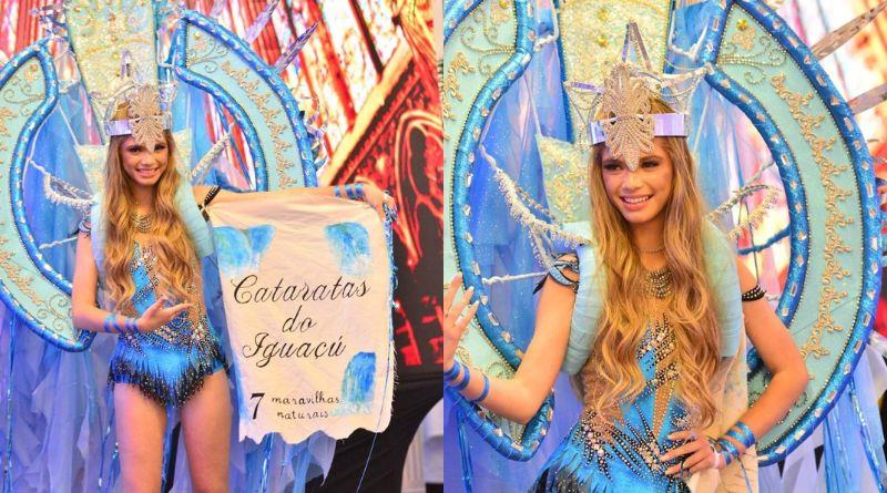 Um dos momentos mais aguardados do concurso é o desfile de traje típico, no qual as candidatas apresentam sua cultura. Isabelly nasceu no estado do Paraná e vestiu uma roupa que representa um pouco do turismo de seu estado: as Cataratas do Iguaçu.